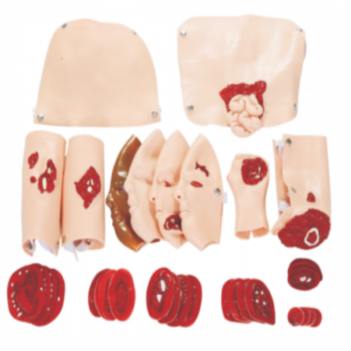 SIMULADOR PARA TREINAMENTO - KIT SIMULADOR DE TRAUMA E FERIDAS,EM RESINA PLASTICA EMBORRACHADA E PCV,COM 33 PECAS SENDO 1 QUEIMADURAS FACIAIS DE I, II E III GRAU, 1 LACERACAO NA TESTA (FERIDA COM SANGRAMENTO), 1 FERIDA NA MANDIBULA (COM SANGRAMENTO), 1 FRATURA EXPOSTA DA CLAVICULA E CONTUSAO TORACICA, 1 TRAUMA ABDOMINAL ACOMPANHADO DE EXPOSICAO DO INTESTINO DELGADO, 1 FRATURA EXPOSTA DO UMERO NO BRACO DIREITO, 1 FERIMENTO DE ARMA DE FOGO NA PALMA DA MAO, 1 FRATURA EXPOSTA DA TIBIA DA PANTURRILHA DIREITA, 1 TRAUMA DE AMPUTACAO DA COXA ESQUERDA, 24 DIFERENTES GRAUS DE LACERACAO E FRATURA ABERTA,EMBALAGEM APROPRIADA PARA ARMAZENAMENTO