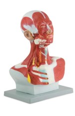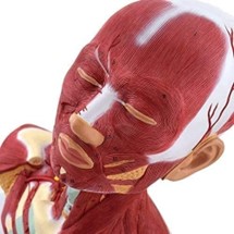 Este modelo mostra o músculo da cabeça, pescoço e região torácica superior. A musculatura superficial e profunda estão bem representadas, assim como as vias das arterias subclávia e carótida .