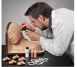 A textura flexível e realista das orelhas requer a mesma manipulação ao usar o otoscópio que a de um paciente vivo. Exercícios realistas de irrigação e limpeza são possíveis com os dois tubos de cera sintética fornecidos com o simulador.